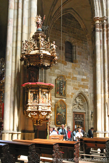 Wnętrze zawiera wiele cennych dzieł sztuki, w tym m.in. gotyckie nagrobki królów czeskich, wiele rzeźb Piotra Parlera, barokowy nagrobek św. Jana Nepomucena. Jeden z witraży jest projektu Alfonsa Muchy.