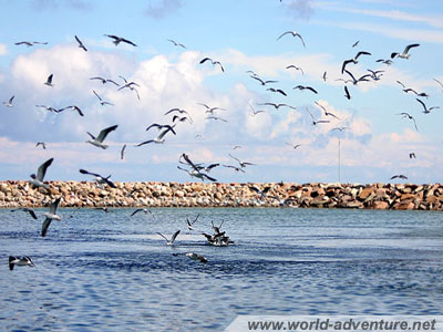 Tu widać dobrze jak wiele mew rzuciło się do wyławiania ryb po przybyciu statku z połowów. Mewy całą gromadą rzucały się do wody, żeby zdobyć jedzenie.
