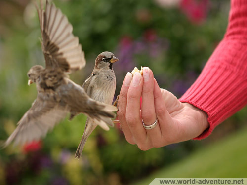 Oswojone ptaki w ogrodzie Luksemburskim w Paryżu.