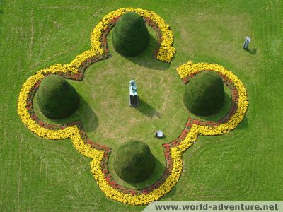 Widok z wieży na trawnik przed wejściem do kościoła w Maastricht.