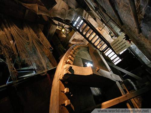 Wielkie koło, które przekazuje naped z pionowego wału we wnętrzu wiatraku na mechanizm napędzający turbinę przepompowującą wodę.